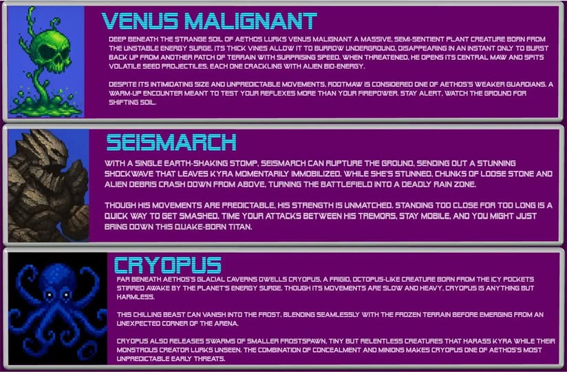 Deep within the planet waits zyrak a colossal sentient war construct forged by the superior Nyzari race. Sent to Aethos long before Kyra’s arrival, Zyrak’s purpose is to judge the planet’s potential for harvesting and to eliminate anything that jeopardizes the Nyzari claim. Upon detecting Kyra, he planted unstable energy cores across Aethos to disable Elysium and force her retreat, ensuring humanity never gains a foothold.