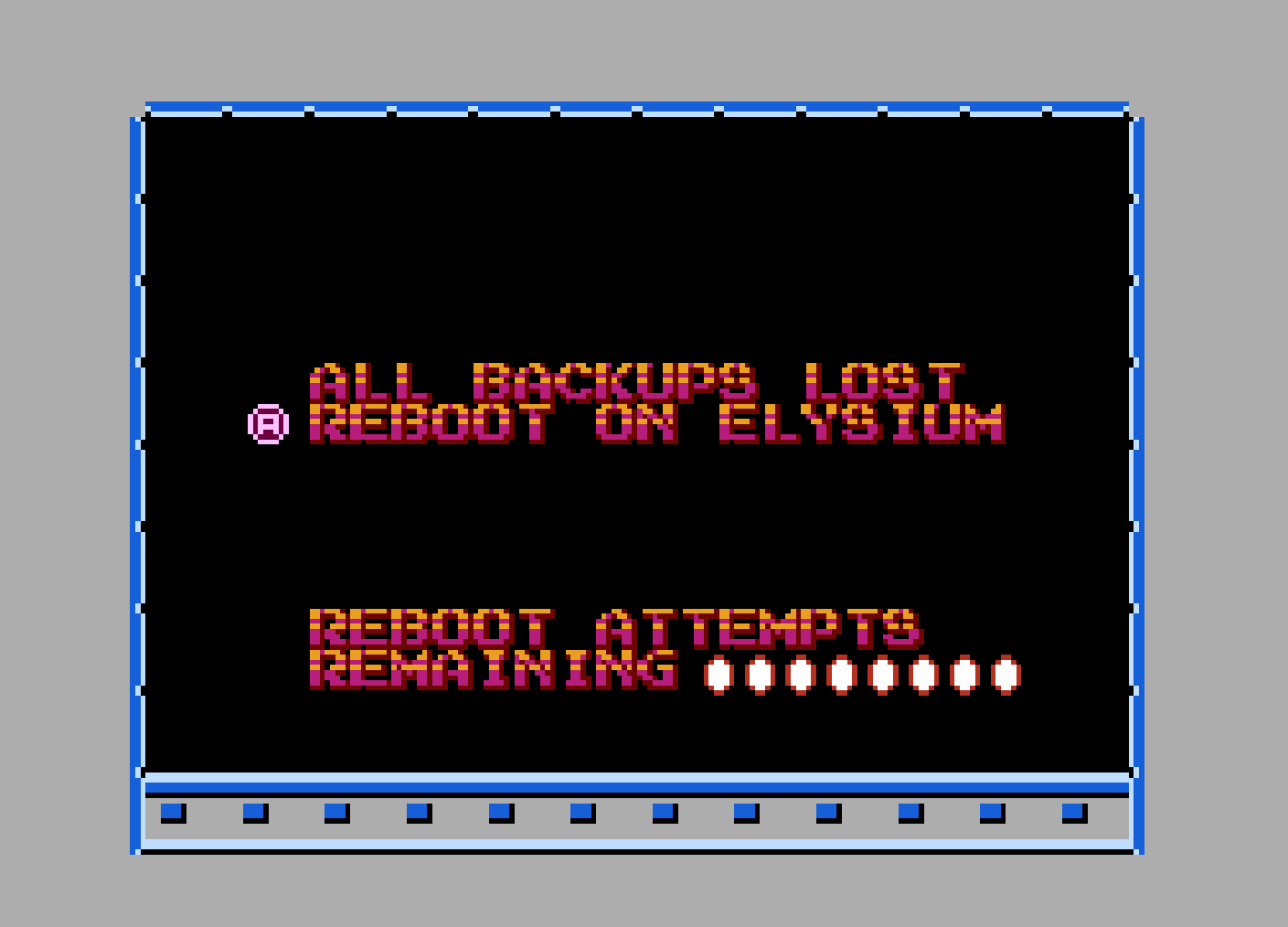 If Kyra exhausts her all backups, she cannot reconstitute at the last Beacon. Instead, a full-system reboot is triggered aboard the Elysium, restoring her body but preserving all mission progress. But if all reboot attempts are lost, Kyra's systems will shut down permanently… and the mission ends in failure, leaving humanity to its fate.